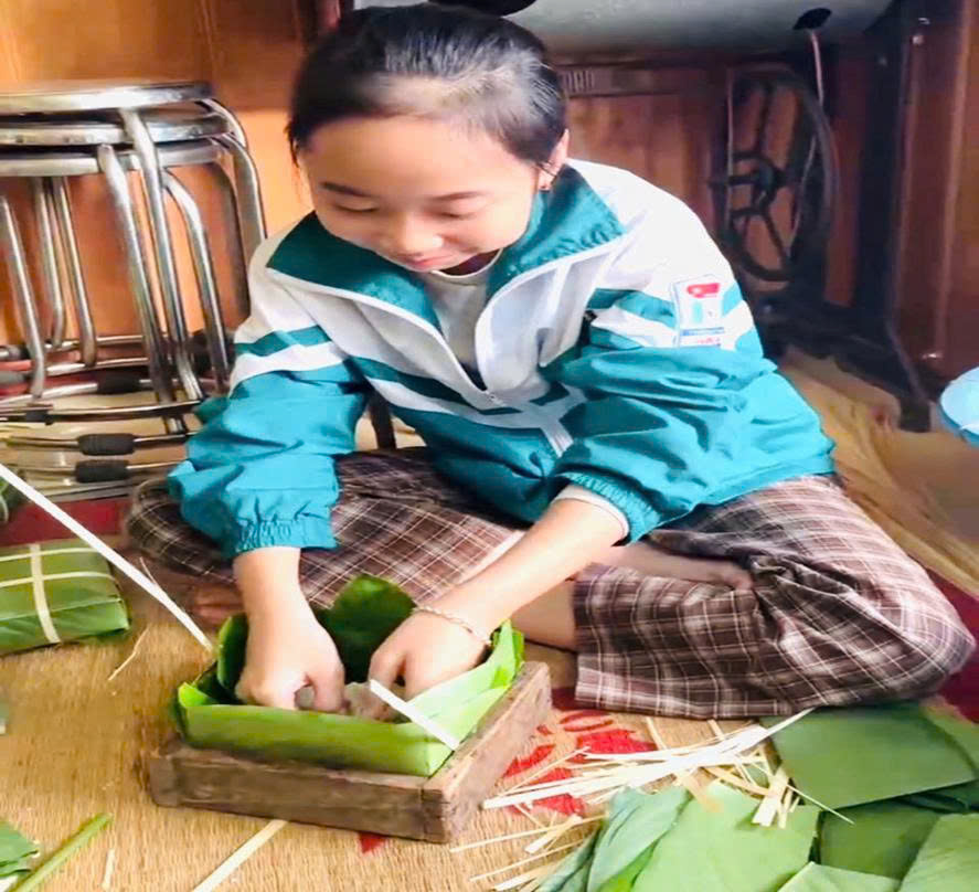 Các em đã cùng cha mẹ dọn dẹp, trang trí nhà cửa, lau dọn bàn thờ gia tiên, treo đèn lồng rực rỡ sắc xuân. Nhiều em hào hứng tham gia gói bánh chưng, tự tay chuẩn bị từng chiếc lá dong, vo gạo, xay đỗ, thể hiện sự khéo léo và tinh thần sẻ chia trong gia đình.